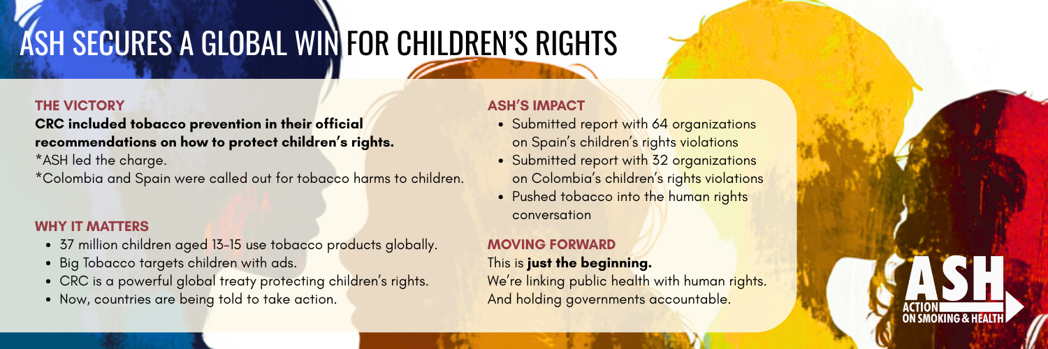 CRC’s concluding observations for both countries are illustrative of the momentum and progress that ASH is facilitating for the tobacco control community in human rights mechanisms.